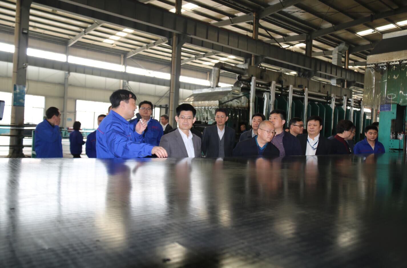 在祥通集團PVC/PVG鋼絲繩輸送帶生產(chǎn)車間門口張繼民一行剛一下車,便受到祥通集團董事長張建魯,總經(jīng)理張振宇,集團公司生產(chǎn)副總姜廣濤,總經(jīng)理助理、企管部經(jīng)理趙逢佩等相關(guān)部門負(fù)責(zé)人的熱情迎接。在張建魯董事長和張振宇總經(jīng)理的陪同下張繼民一行來到生產(chǎn)現(xiàn)場,一邊看,一邊就企業(yè)發(fā)展現(xiàn)狀聽取了張建魯董事長的匯報。張董事長向張繼民主席一行匯報說:“經(jīng)過十六年的快速發(fā)展,祥通無論是產(chǎn)品質(zhì)量還是品牌形像,在國內(nèi)外市場上都是首屈一指的,特別是在高端輸送帶產(chǎn)品研發(fā)方面,祥通多項研發(fā)成果填補了國內(nèi)行業(yè)的空白。當(dāng)前,我們祥通不缺市場,也不缺產(chǎn)品訂單,缺的是生產(chǎn)能力和擴大生產(chǎn)的流動性資金。由于受其因素的制約,一些要貨比較急的產(chǎn)品訂單,只好放棄了……”聽了張建魯董事長的匯報后張繼民一行對祥通十六年來堅守做實業(yè),并取得不錯的成績給予了充分的肯定,對祥通面臨的擴大發(fā)展資金瓶頸問題表示關(guān)注。