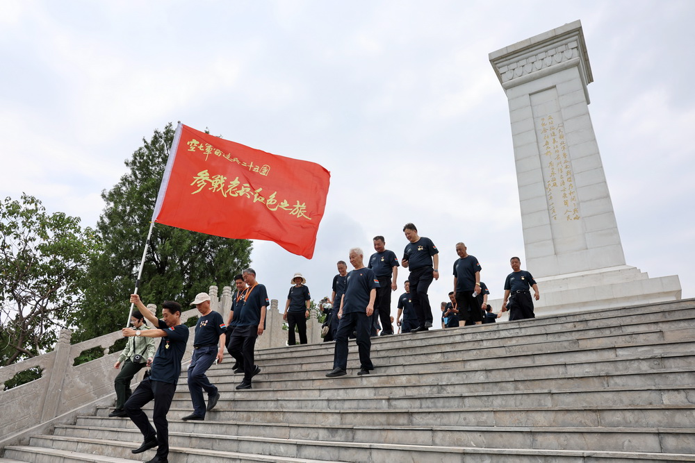 車廂里的歡歌笑語(yǔ)還未停息,隨著司機(jī)輕輕一腳剎車,將眾人從重逢的熱絡(luò)中帶入到對(duì)歷史的追思。大巴車緩緩駛?cè)媵斘髂蠎?zhàn)役紀(jì)念園門前廣場(chǎng)旁,老兵們精神矍鑠,步伐鏗鏘地走下車,迅速集合列隊(duì)。在莊重的氛圍中,林存弟政委向參戰(zhàn)老兵蘇興華鄭重授旗。那面印有“空七軍雷達(dá)兵二十五團(tuán)參戰(zhàn)老兵紅色之旅”的紅旗,在風(fēng)中烈烈招展,仿佛在訴說(shuō)著老兵們往昔的崢嶸歲月,也承載著他們對(duì)紅色歷史的敬畏與傳承。