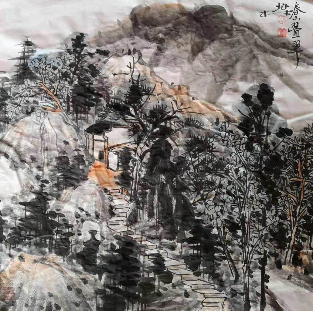 品鑒荊兆林的作品,能夠深切感受到暗融在他作品深處的那種悠遠(yuǎn)的中華傳統(tǒng)文化氣韻。其間,既活泛著百回千折的陰柔之美、虛實相生的朦朧之韻,同時又不乏古樸典雅的純真之情與古今融合的歷史厚重感,光韻悠遠(yuǎn),回味無窮。他的山水畫取法范寬、石濤、八大、黃賓虹、黃秋元等諸家,注重寫生,在深入生活中與古人交流,與歷史對歌,與大自然談心。畫面仍以滿構(gòu)圖見長,大壑突起,直沖云霄,壯懷激烈,雄氣磅礴。在用筆用墨上也相當(dāng)講究,在反復(fù)皴擦中激活畫面,既厚重沉潛又滋潤鮮活,達(dá)到了水墨交融、點線面交織、近看見質(zhì)、遠(yuǎn)觀見勢的視覺效果。他獨創(chuàng)的“人物花鳥畫”作品取材寬泛,意境深幽,或瀑布高垂,或群鴨戲荷,或踏春,或趕集,或采藥,或團(tuán)聚……信手拈取,不一而足,注重多勢交融,多層重疊,平而不凡,人景一體,立體出戲,使畫面靜如處子,動如脫兔,氣象高遠(yuǎn),新意迭出,觀之心動,賞之動容。