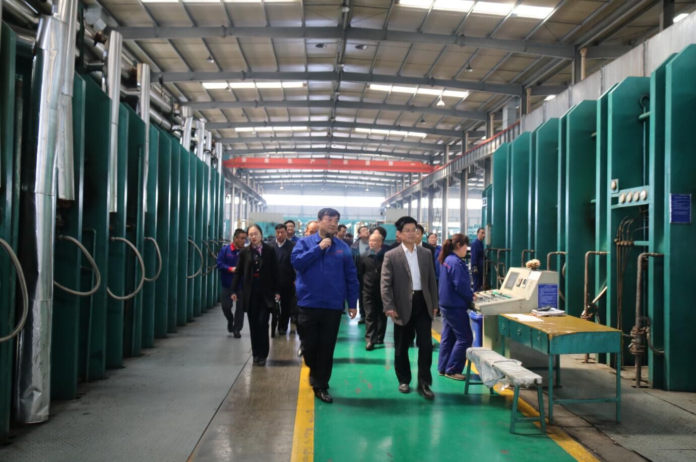 在祥通集團PVC/PVG鋼絲繩輸送帶生產(chǎn)車間門口張繼民一行剛一下車,便受到祥通集團董事長張建魯,總經(jīng)理張振宇,集團公司生產(chǎn)副總姜廣濤,總經(jīng)理助理、企管部經(jīng)理趙逢佩等相關(guān)部門負(fù)責(zé)人的熱情迎接。在張建魯董事長和張振宇總經(jīng)理的陪同下張繼民一行來到生產(chǎn)現(xiàn)場,一邊看,一邊就企業(yè)發(fā)展現(xiàn)狀聽取了張建魯董事長的匯報。張董事長向張繼民主席一行匯報說:“經(jīng)過十六年的快速發(fā)展,祥通無論是產(chǎn)品質(zhì)量還是品牌形像,在國內(nèi)外市場上都是首屈一指的,特別是在高端輸送帶產(chǎn)品研發(fā)方面,祥通多項研發(fā)成果填補了國內(nèi)行業(yè)的空白。當(dāng)前,我們祥通不缺市場,也不缺產(chǎn)品訂單,缺的是生產(chǎn)能力和擴大生產(chǎn)的流動性資金。由于受其因素的制約,一些要貨比較急的產(chǎn)品訂單,只好放棄了……”聽了張建魯董事長的匯報后張繼民一行對祥通十六年來堅守做實業(yè),并取得不錯的成績給予了充分的肯定,對祥通面臨的擴大發(fā)展資金瓶頸問題表示關(guān)注。