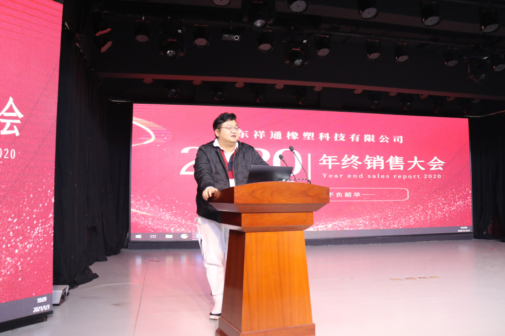 2021年1月3日,以“總結成績堅定信心 謀劃目標砥礪奮進”為主題的山東祥通橡塑科技有限公司2020年終銷售總結大會在祥通多功能廳召開。本次會議旨在總結過去一年祥通科技公司銷售工作取得的成績和分析存在的問題,同時為2021年銷售工作定調(diào)子、指方向、鼓干勁。集團董事長張建魯,集團總經(jīng)理張振宇,集團常務副總經(jīng)理王冬,集團生產(chǎn)常務副總經(jīng)理姜廣濤,集團副總經(jīng)理杜允峰,銷售總監(jiān)王長友和各銷售部經(jīng)理及銷售骨干50余人參加了會議。