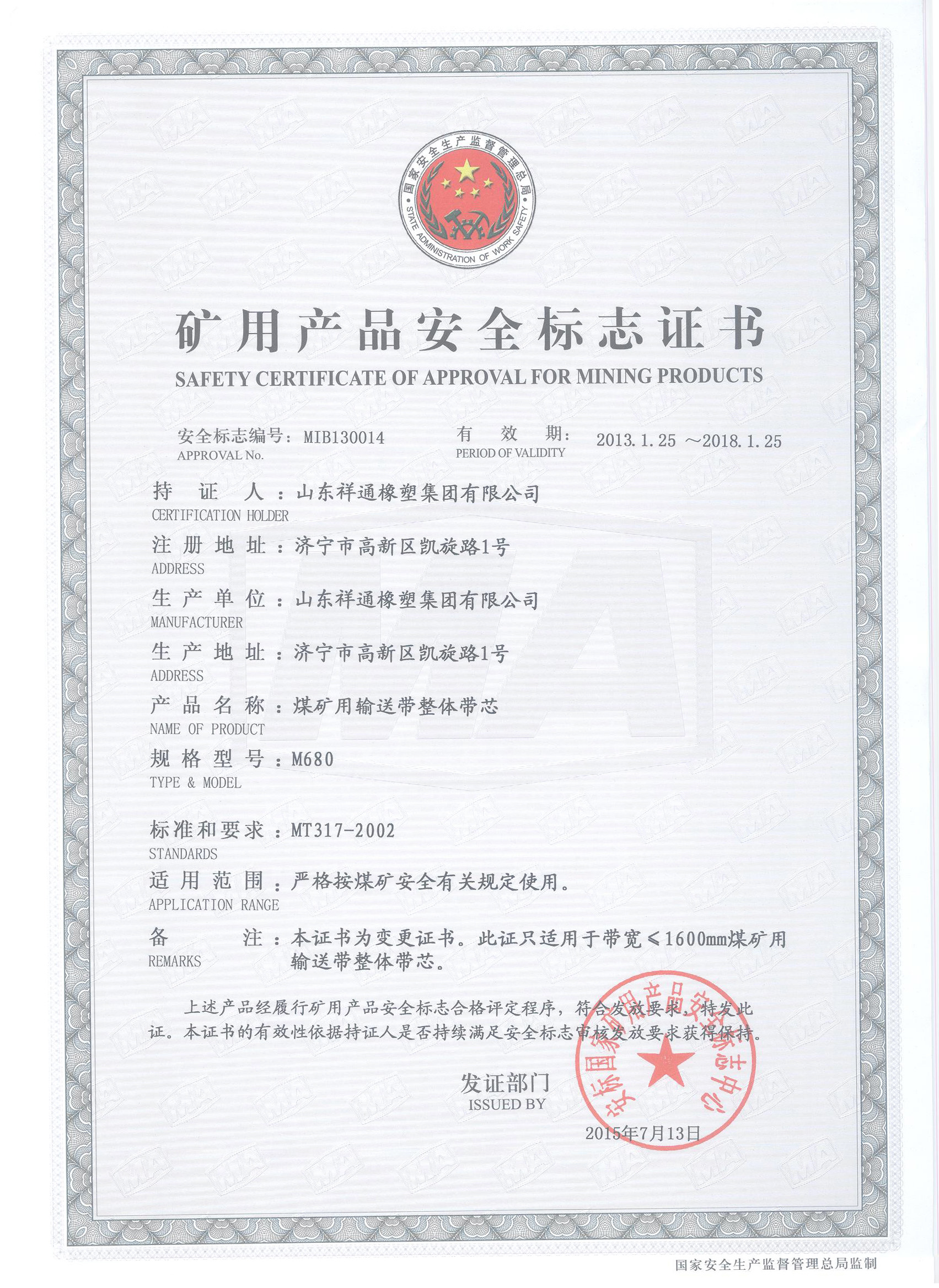 礦用產品安全標志證書