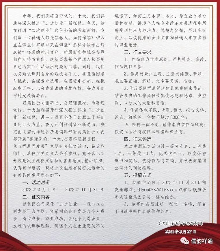 喜迎、歡慶黨的二十大,開創(chuàng)祥通新局面——“我與祥通同發(fā)展”主題征文活動啟事